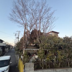 取手市内のマンション剪定工事を行いました。 高木のクスノキを数年ぶりに強剪定しました。時期的にはあまり適期ではありませんが、落ち葉、鳥害があるため冬の剪定を実施しました。