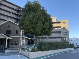 マンション高木剪定 投稿日: 20260226 投稿者: 秀庭園の中の人 取手市内のマンション剪定工事を行いました。 高木のクスノキを数年ぶりに強剪定しました。時期的にはあまり適期ではありませんが、落ち葉、鳥害があるため冬の剪定を実施しました。